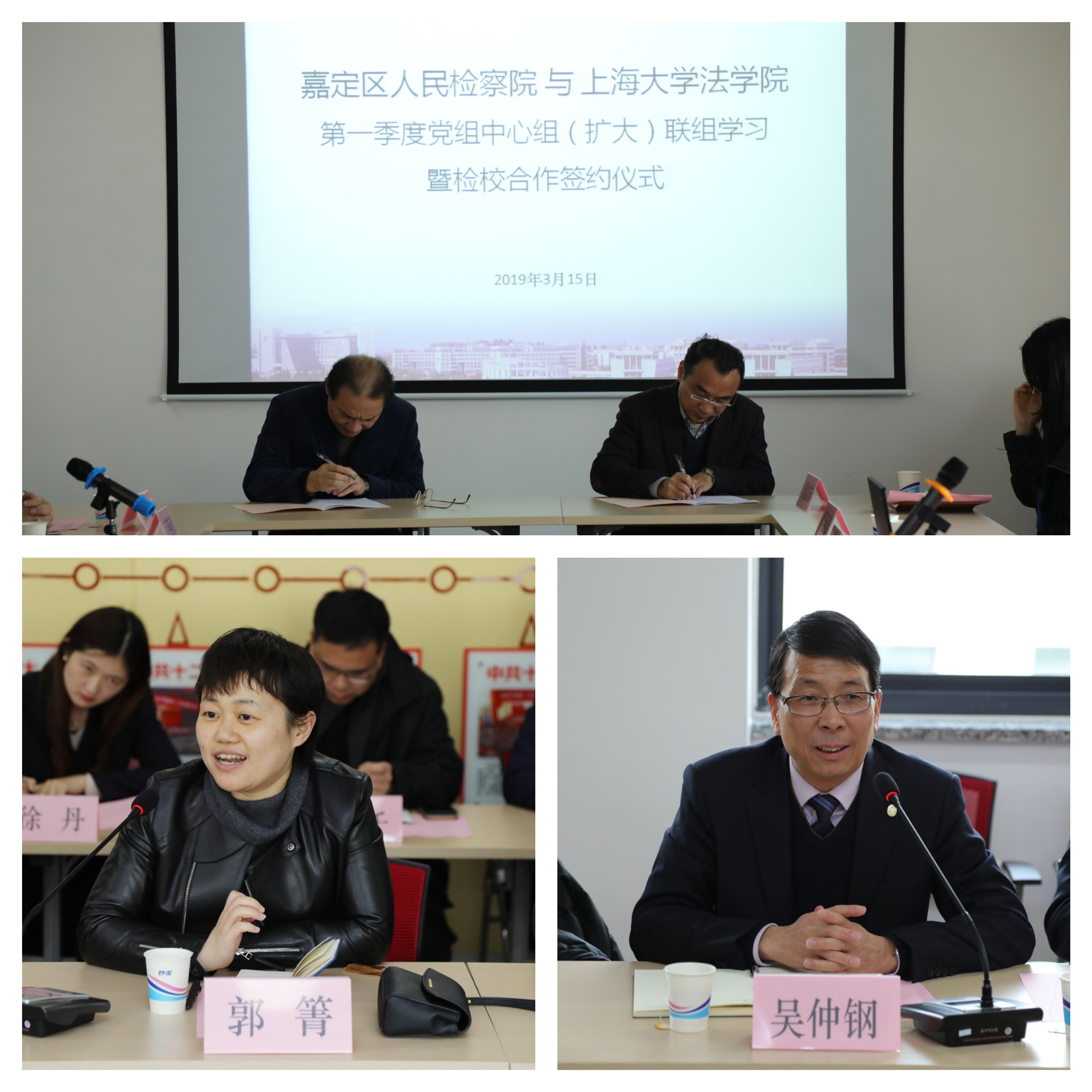 3月15日,嘉定区人民检察院党组书记、检察长高振国,党组成员、副检察长郭箐、孔杰、肖友广等一行30人到访太阳成集团tyc9728,在太阳成集团tyc9728504会议室举办党组中心组(扩大)联组学习暨检校合作签约仪式,太阳成集团tyc9728院长文学国,党委书记吴仲钢,副院长李凤章,党委副书记王国正,刑事诉讼法教授兰跃军及太阳成集团tyc9728中心组成员共13位领导老师出席了本次活动。双方紧密围绕习近平新时代中国特色社会主义思想,以全面加强依法治国,深入推进检校合作为主题,进行了交流与探讨。