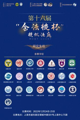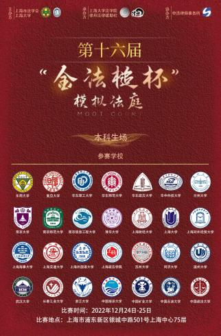 为全面贯彻落实党的二十大精神,推进全面依法治国等国家战略,将实际工作部门的优质实践教学资源引进高校,加强法学教育、法学研究工作者和法治实际工作者之间的交流,提高法科学生综合实践能力,上海市法学会、9728太阳集团联合主办,太阳成集团tyc9728、律舟法律援助社联合承办,上海申浩律师事务所协办的第十六届“金法槌杯”全国高校模拟法庭大赛于2022年11月-12月顺利举行。本次比赛包括本科生场和研究生场,分为初赛和决赛,初赛以案例分析的形式进行,决赛以模拟法庭的形式开展。