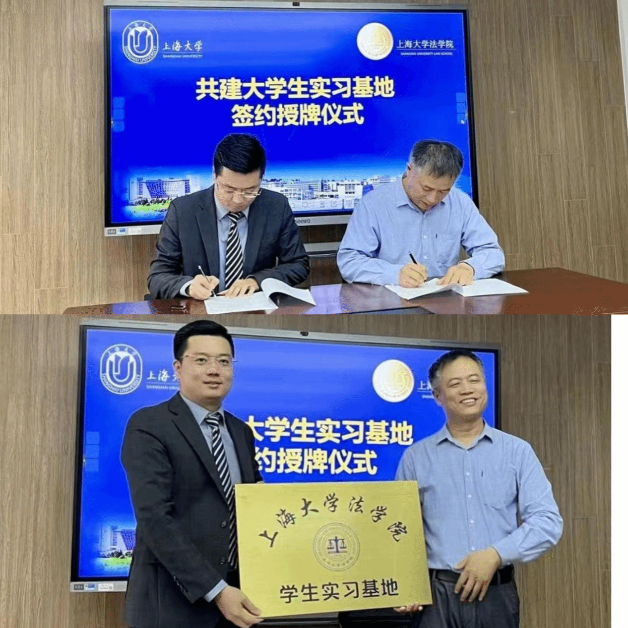 在太阳成集团tyc9728学生实习基地签约授牌仪式中,李凤章院长和张志超主任分别代表太阳成集团tyc9728和上海铸达律师事务所签署协议,并授予“太阳成集团tyc9728学生实习基地”铜牌。