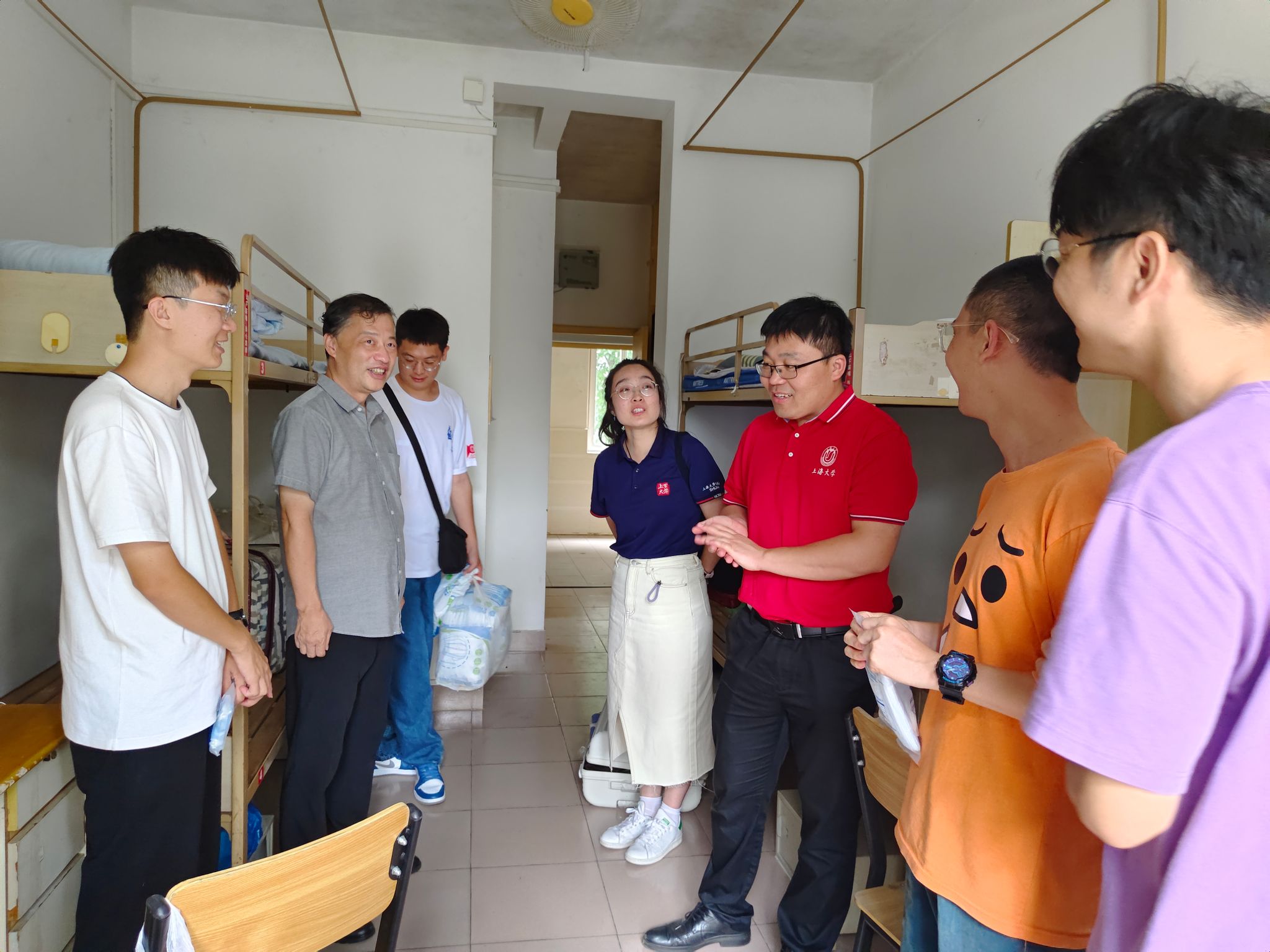 太阳成集团tyc9728党委书记徐国明、院长李凤章、党委副书记、副院长于伟、副院长袁真富来到迎新现场、学生宿舍指导慰问,为新同学们送上来自学院的关怀。各位领导详细了解了新生报到情况,对2023级研究生新生们表示热烈欢迎,对参与迎新工作的志愿者们致以慰问,深入学生宿舍走访慰问新生,叮嘱同学们要尽快适应新环境,勉励同学们做好研究生规划、提升专业本领。