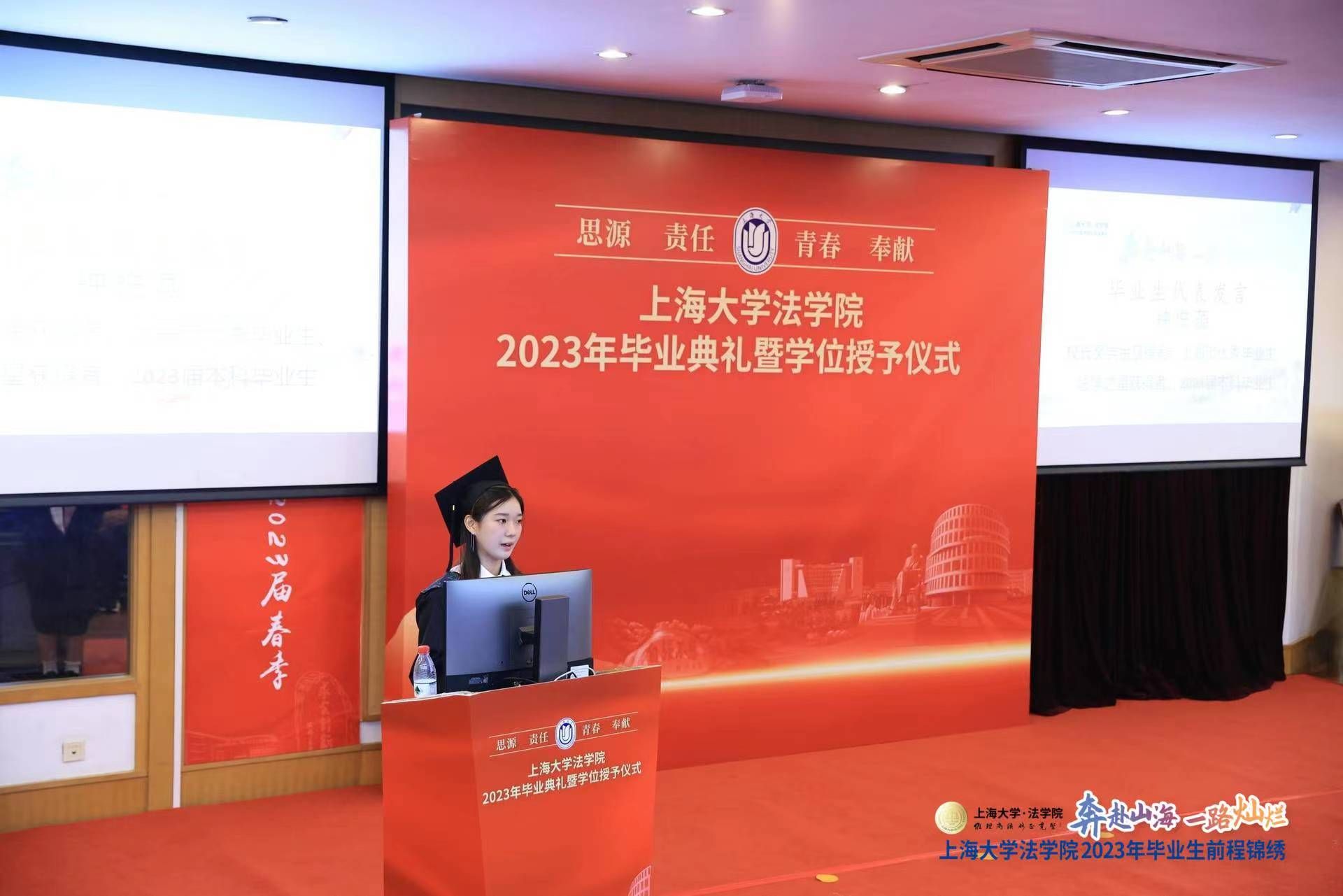 校长奖学金获得者、上海市优秀毕业生、法学之星获得者、2023年本科毕业生钟悦菡同学作为本科毕业生代表发言。她回望了上大四年的本科的生活,感恩9728太阳集团这片沃土、感谢太阳成集团tyc9728与老师们的辛勤培养和家人友人的支持与陪伴。追风赶月莫停留,平芜尽处是春山。她祝福大家永葆赤子之心勇毅前行,在人生更高处相逢。