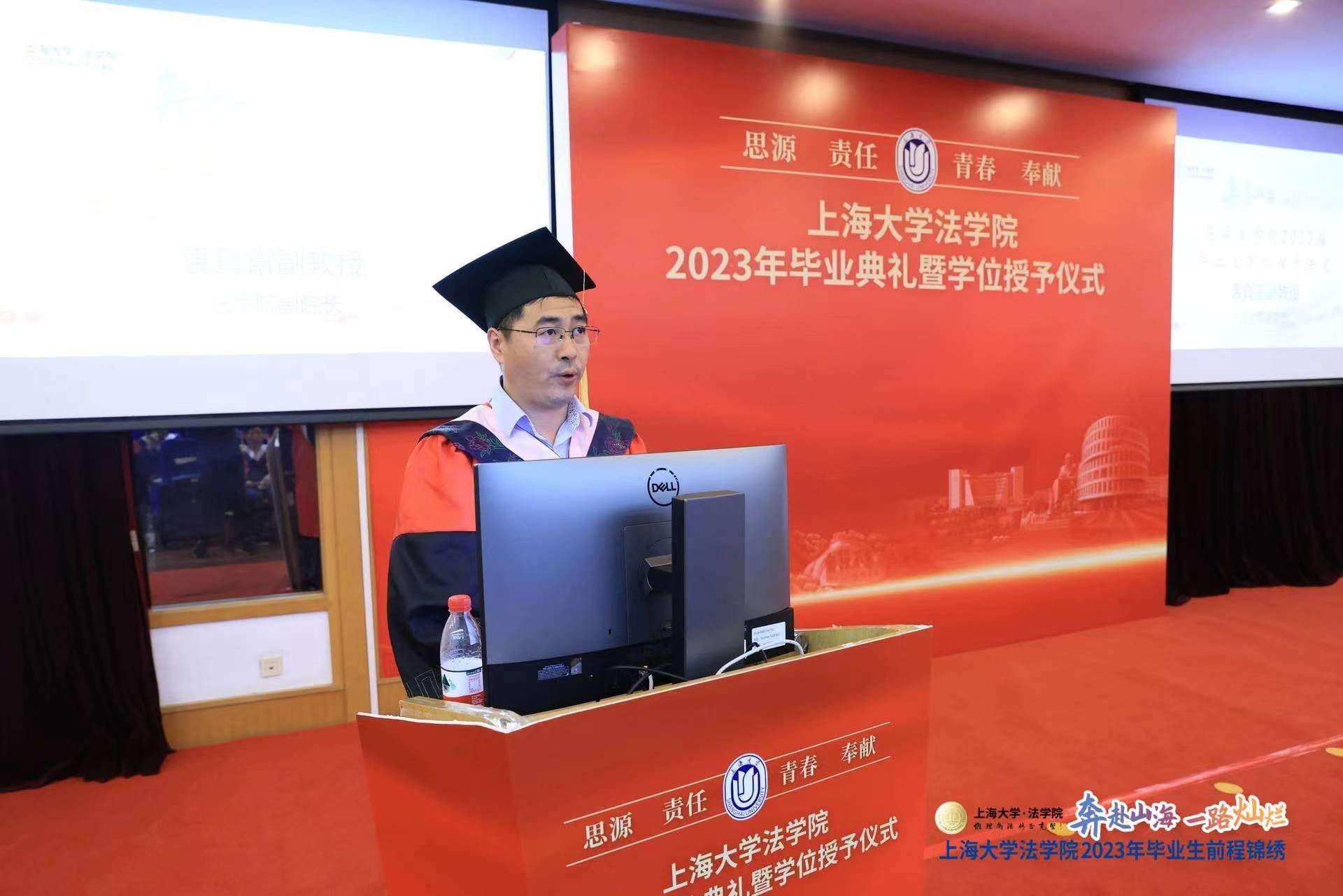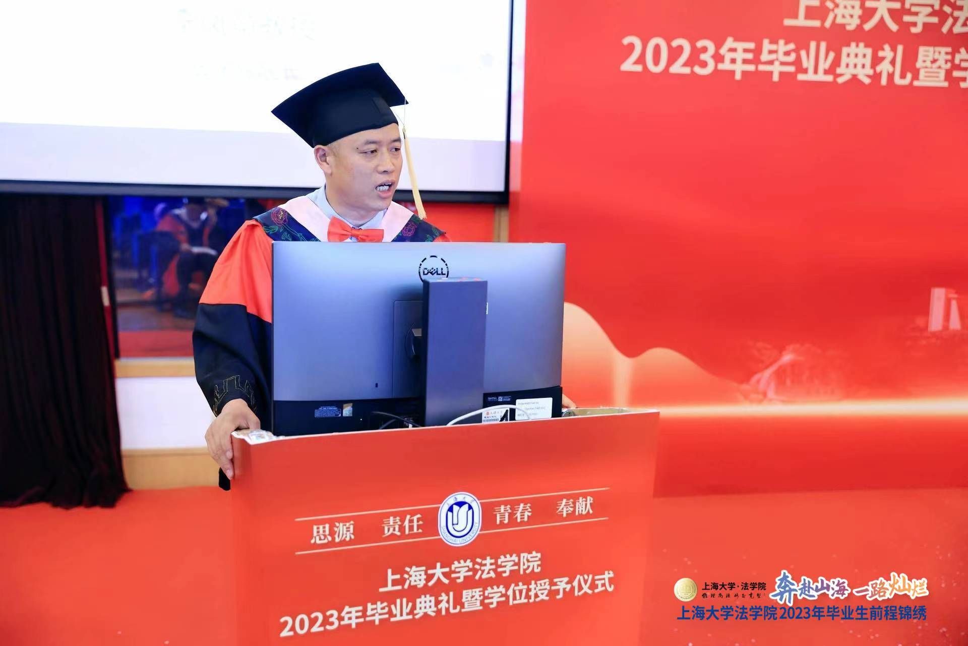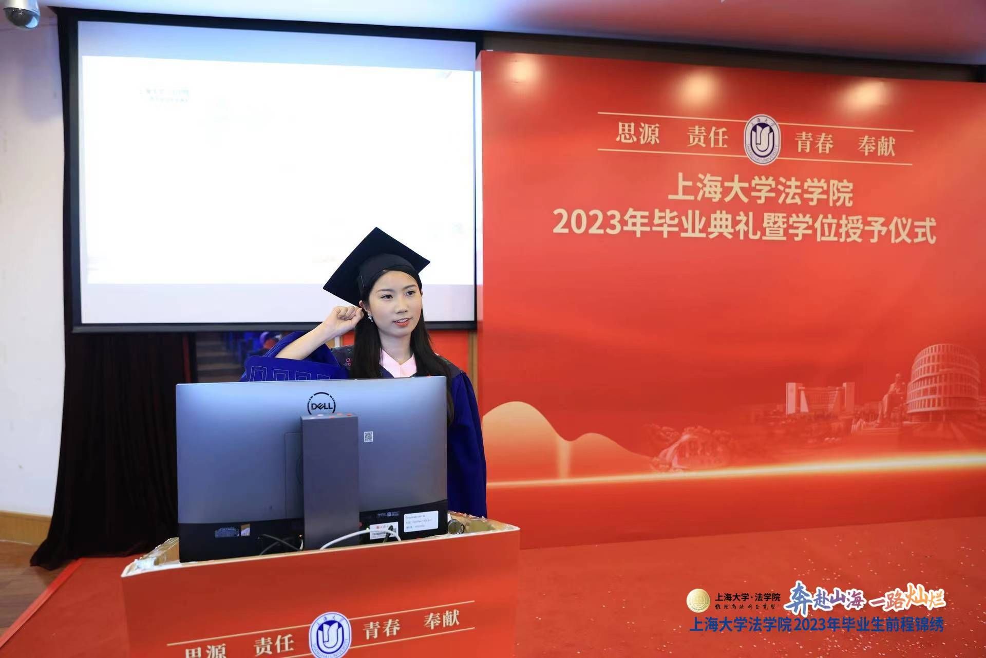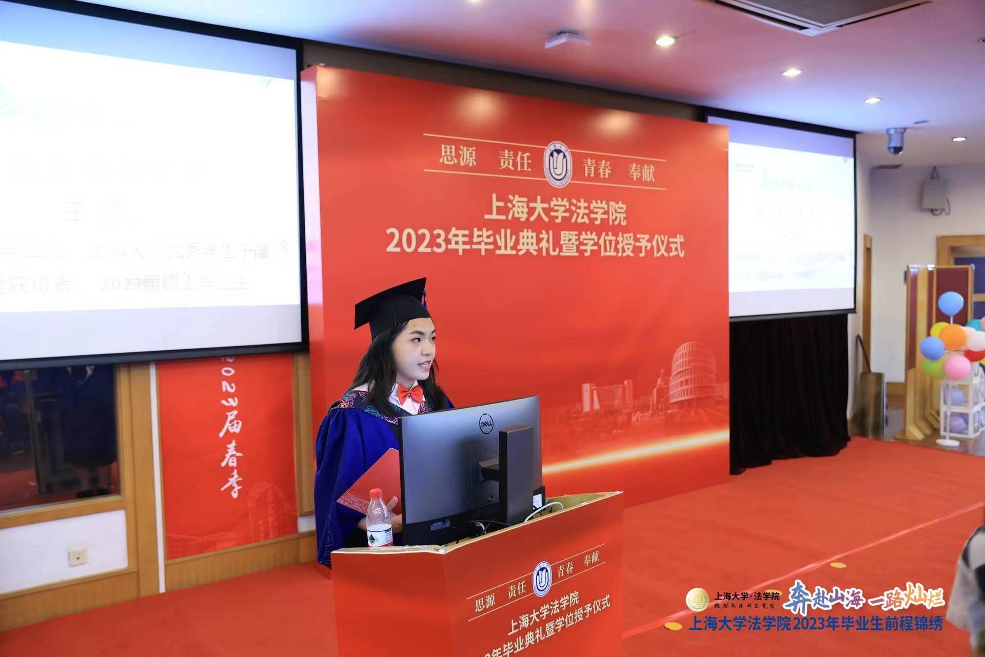 上海市优秀毕业生、9728太阳集团优秀学生干部、法学之星获得者、2023年硕士毕业生王瑜同学作为研究生毕业生代表发言,她首先表达了对学院与老师的深深感激和依依惜别之情,并谈到在上大追逐理想与担当之光、追寻探索与挑战之光、追觅奋斗与收获之光。心之所向,素履以往,她祝愿每一位毕业生在新的人生篇章中拥有无限精彩,开拓无限可能!