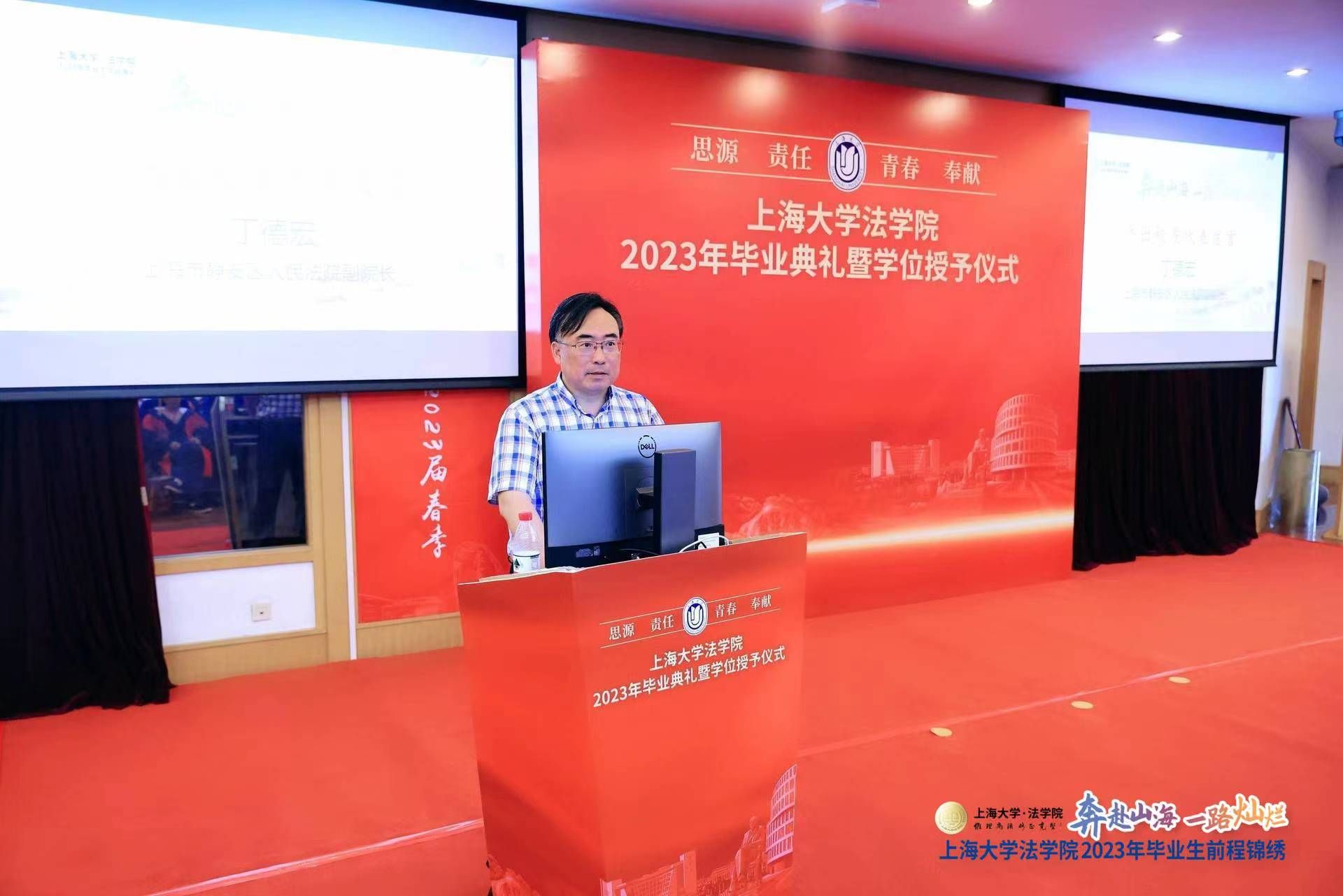 法脉相连,学长情深。太阳成集团tyc9728校友会副会长、上海市静安区人民法院副院长丁德宏作为校友代表发言。丁德宏校友以茶引喻,结合本人从事法律工作多年的感悟与经历,感慨同学们成长在充满变革与挑战机遇的美好时代;以屈原与庄子为例,感慨屈原不愿随波逐流,而庄子秉持随遇而安,大道无为,告诉同学们人生就像是一场马拉松,激励同学们不要看一时一世,要放眼更加长远的人生。