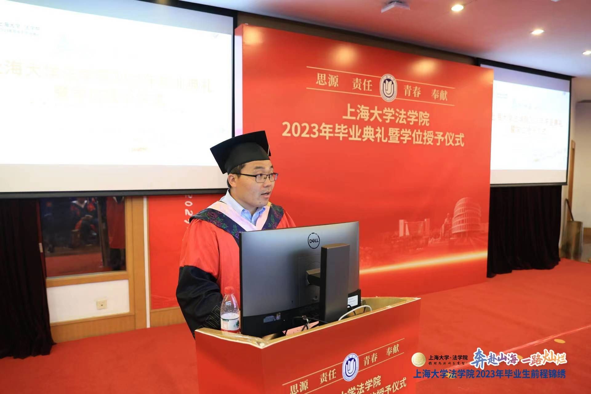接下来是李凤章院长对毕业生的寄语。李院长首先祝贺全体毕业生顺利毕业,接着与大家分享了几点心得。第一是用结构主义的视角去理解社会,不要纠缠于无关紧要的细节。第二是为生命寻找和注入干细胞,抓住主要矛盾。第三是在罗尔斯无知之幕的背后相信真理与正义的力量,尊重生命、尊重自由、尊重契约,不要局限于当下,放眼未来。第四是学会利他,法治意义上的主体不应该自我封闭,唯我独尊,而应该是捍卫自己利益的同时也尊重他人的权益。第五是敢于思考与坚持,拥有特立独行的勇气,面对挑战多一些克服当下困难的勇气和放眼未来勇于创造的胸怀。最后李院长表达了对全体毕业生一起为中国的法治未来打拼的殷切期盼