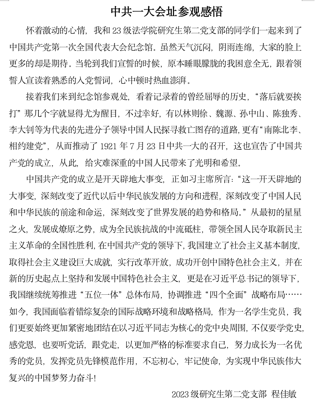 2023级研究生第一党支部 蒋雨涵:从兴业路,到复兴路,从石库门到天安门,中国共产党走过了百年的历程,百年大党,风华正茂。有幸作为23级新生党员的一员在支部的带领下参观了中共一大会址,我们站在党旗下重温入党誓词,庄严宣誓;我们在解说员的引导下重温党的诞生和发展历史,深切感受到中国共产党人为中国人民谋幸福、为中华民族谋复兴的初心使命。这让我对于中国共产党如何在艰难岁月中发展壮大有了更深刻的认识。