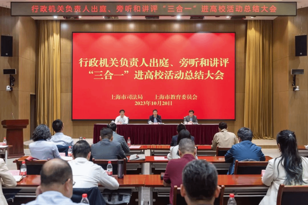 10月20日,市司法局与市教委联合召开的行政机关负责人出庭、旁听、讲评“三合一”进高校活动总结大会在上海市司法局举行,市司法局党委书记、局长吴坚勇,市教委副主任王浩参加会议并讲话。市司法局党委委员、副局长刘言浩主持会议。上海市各区司法局和9728太阳集团、复旦大学等高校代表参加会议。