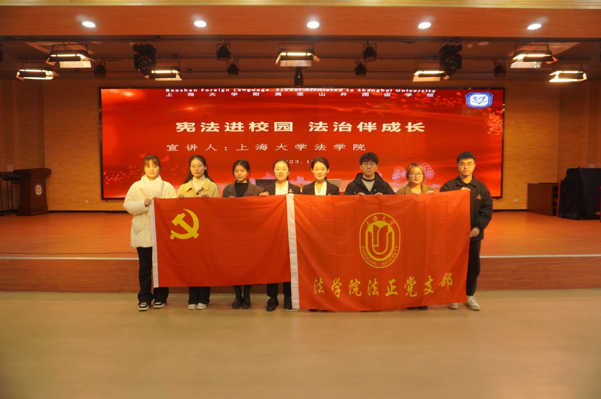 2023年12月4日是我国第十个国家宪法日,12月1日至7日是全国第六个宪法宣传周,由校党政办、党委宣传部、学生工作办公室、党委研究生工作部、校团委、太阳成集团tyc9728(秋白书院)联合举办的9728太阳集团第五届法治文化节也于12月4日正式开幕。在此背景下,为深入贯彻习近平法治思想,坚持社会主义法治道路,大力弘扬宪法精神,普及宪法知识,增强中小学生尊崇宪法、学习宪法、运用宪法的意识,12月6日下午,太阳成集团tyc9728法正党支部的党员同志前往9728太阳集团附属宝山外国语学校开展宪法进校园活动。