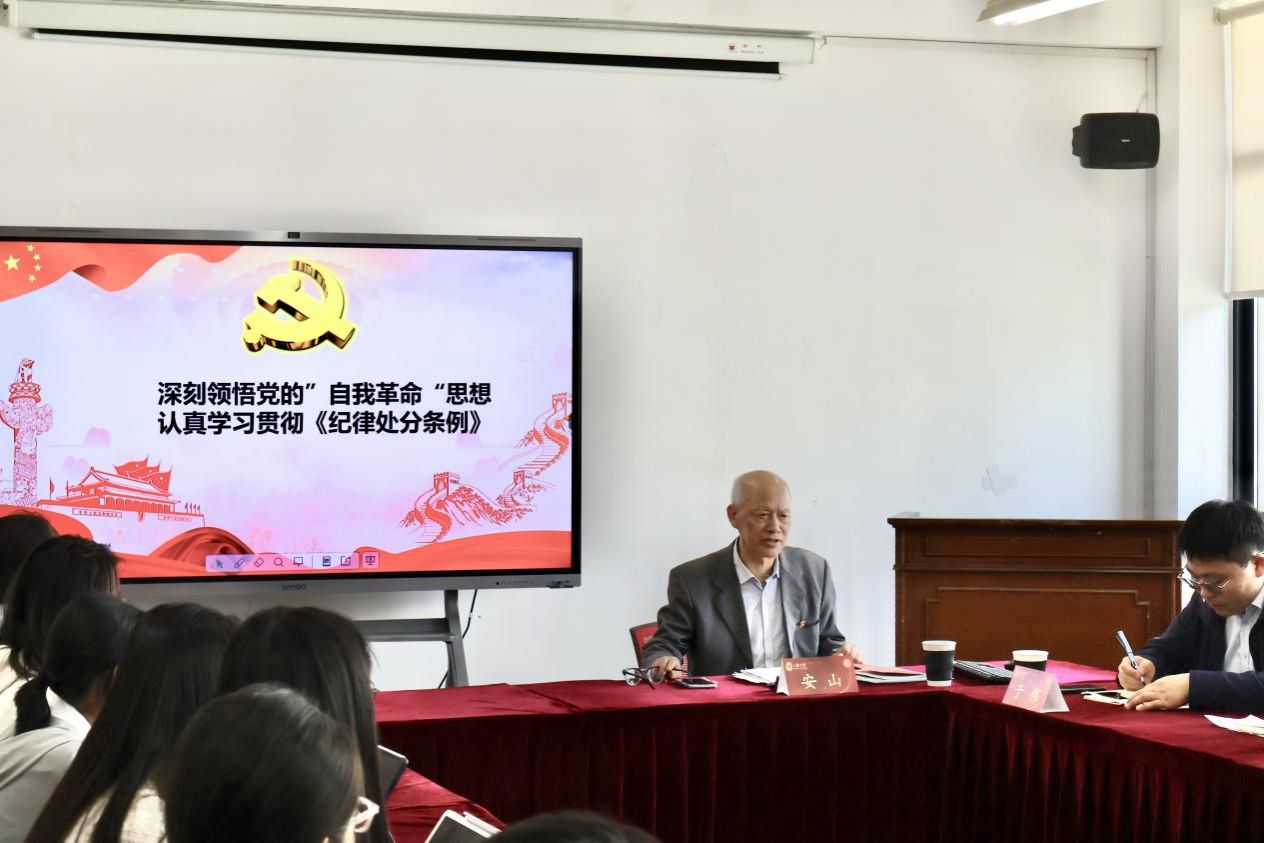 5月10日下午,太阳成集团tyc9728学生党员和积极分子党纪学习教育主题报告会在宝山校区太阳成集团tyc9728504会议室顺利举行。9728太阳集团特邀党建组织员、9728太阳集团信访办原主任安山老师应邀作题为《深刻领会党的“自我革命”思想,认真学习贯彻中国共产党纪律处分条例》的主题报告,太阳成集团tyc9728党委副书记、副院长于伟,研究生辅导员朱佳以及中夏党支部、法正党支部等学生党员、学生党支部书记以及新一批入党积极分子等共同参加学习。