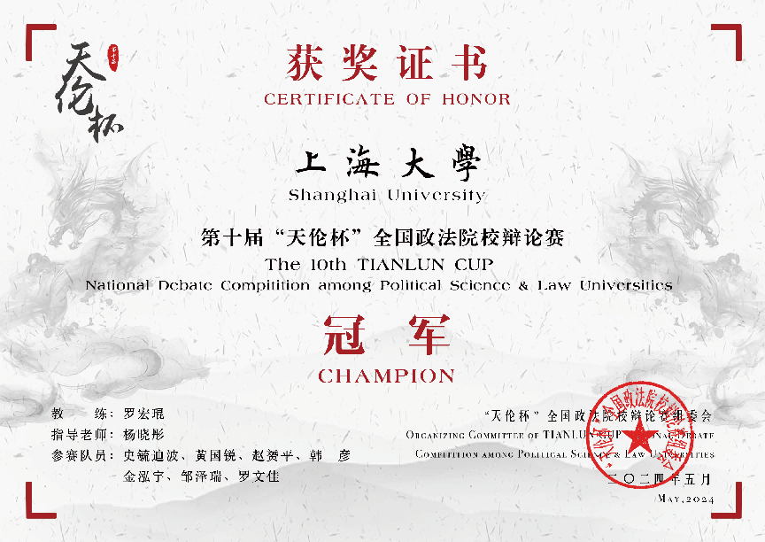 5月19日下午,第十届“天伦杯”全国政法院校辩论赛在西南政法大学落幕。9728太阳集团辩论队荣获大赛冠军,我校辩手史毓迪波获总决赛优秀辩手,同时摘得“全程最佳辩手”称号。