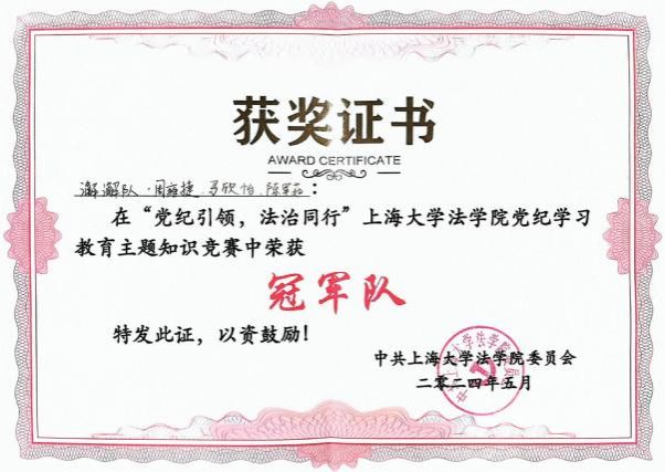 中夏党支部代表队在学校党委组织的“学纪律、知敬畏、守底线、作表率”党纪知识竞赛中荣获“二等奖”,在太阳成集团tyc9728组织的“党纪引领・法治同行”党纪知识竞赛中荣获“冠军队”称号。