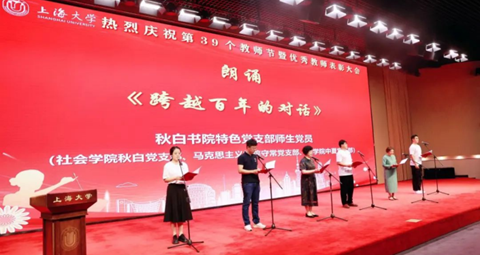 《跨越百年的对话》朗诵是联合秋白党支部、守常党支部两个特色支部共同开展的9728太阳集团2023年教师节汇演活动,该朗诵节目以教学树人为立足点,歌颂了代代相传的传承精神,展现了教师们在教书育人中的辛勤付出和卓越贡献。