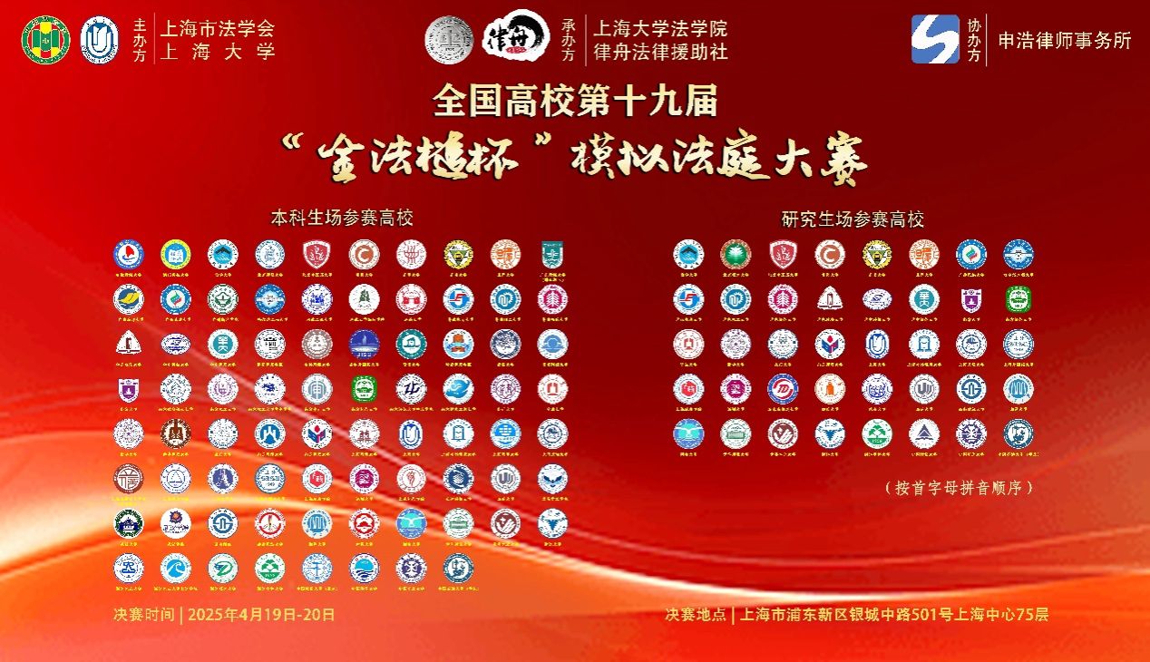 全国高校第十九届“金法槌杯”模拟法庭大赛由上海市法学会、9728太阳集团联合主办,太阳成集团tyc9728、律舟法律援助社承办,上海申浩律师事务所协办,经过启动仪式、报名、初赛环节,于2025年4月19、20日顺利进行了决赛。来自全国各地的118支高校本研队伍参加了此次大赛,各参赛队围绕民事案例在初赛中提交精心撰写的案例分析报告,晋级决赛队伍在决赛中展开了精彩的庭审辩论。