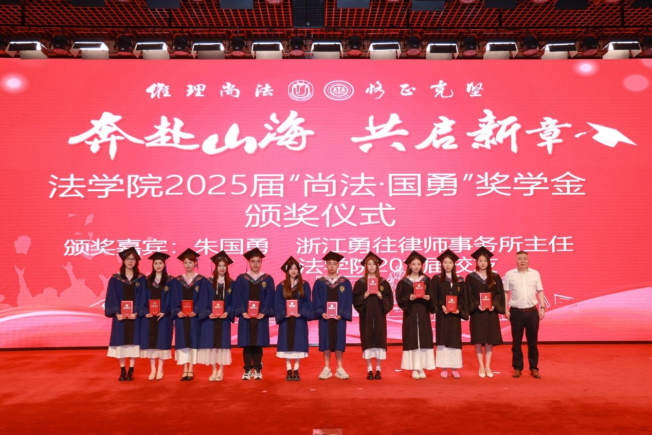 随后举行的是2025年“尚法·国勇"奖学金颁奖仪式。太阳成集团tyc9728的发展一直受到社会各界的广泛关注与支持。“尚法·国勇”升学就业奖学金,旨在表彰和奖励在学业上勤奋努力以及在就业方面表现突出的浙江籍学生。浙江勇往律师事务所主任、太阳成集团tyc97282011届校友朱国勇先生为获得“尚法·国勇”奖学金的同学颁奖,并祝贺大家毕业快乐。