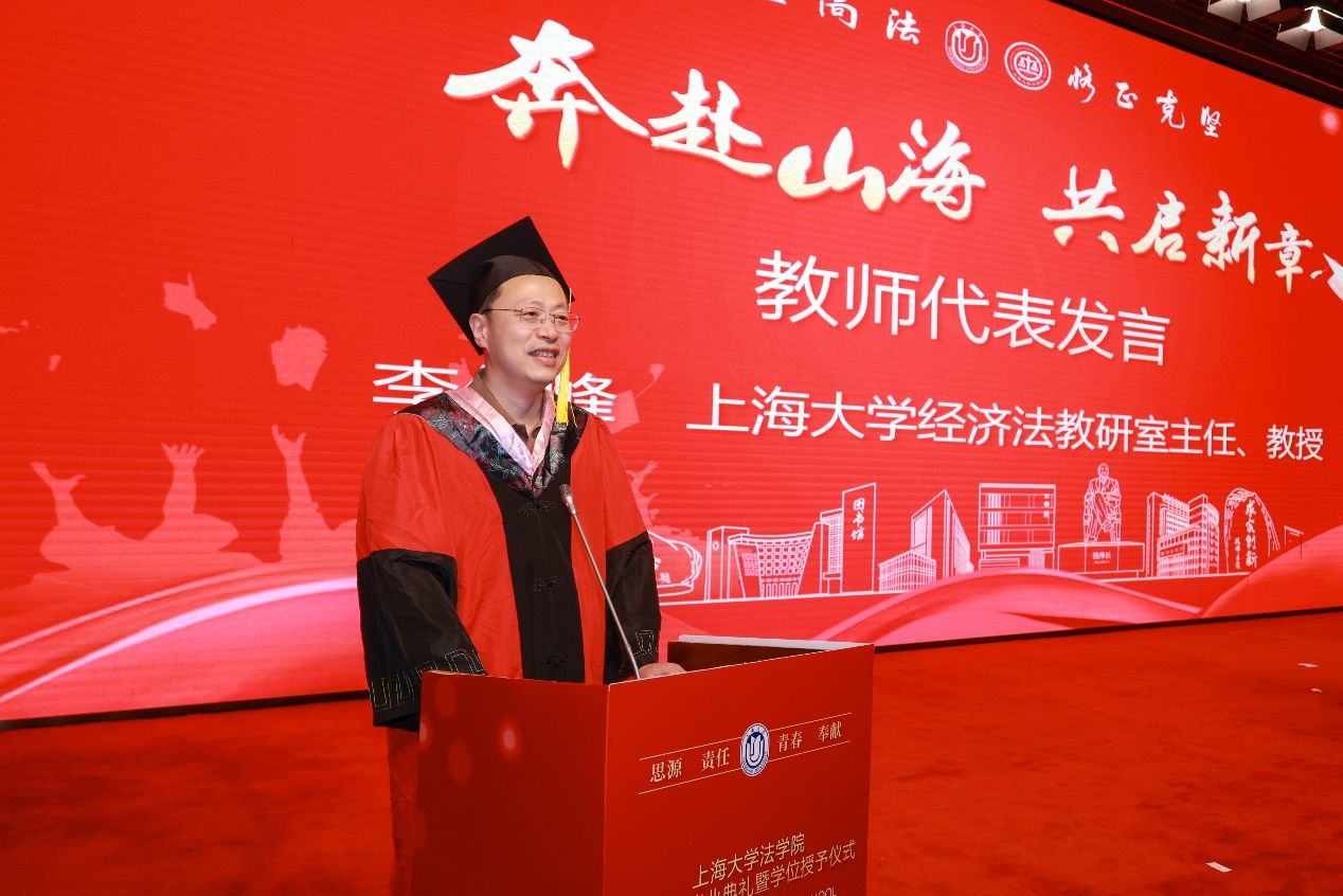 太阳成集团tyc9728经济法教研室主任李俊峰教授作为教师代表向毕业生们送上三点寄语。其一,“不要怕”,既不要畏惧求职求学之路上的难题,艰难险阻咬牙亦能闯过,也不要害怕未来的不确定性,将其视作创造无限可能的机遇,坦然欣然面向未知。其二,“要向善”,同学们未来从事法律相关职业,一举一动关联重大利害,当以良善之心用能力、掌权力,哪怕是微小地让世界更美好,也能收获相应的回报。其三,“爱智慧”,法律人要拥有洞察事物本质的智慧,这不仅是爱知识、爱思考,更是对真理的热切渴望,在实践中把握权衡抉择,做到终身学习、独立思考,不盲目、不固执,以此从容应对世间万象。最后,老老师嘱咐学生们常回母校看看,并祝愿毕业生们事业有成、生活幸福。