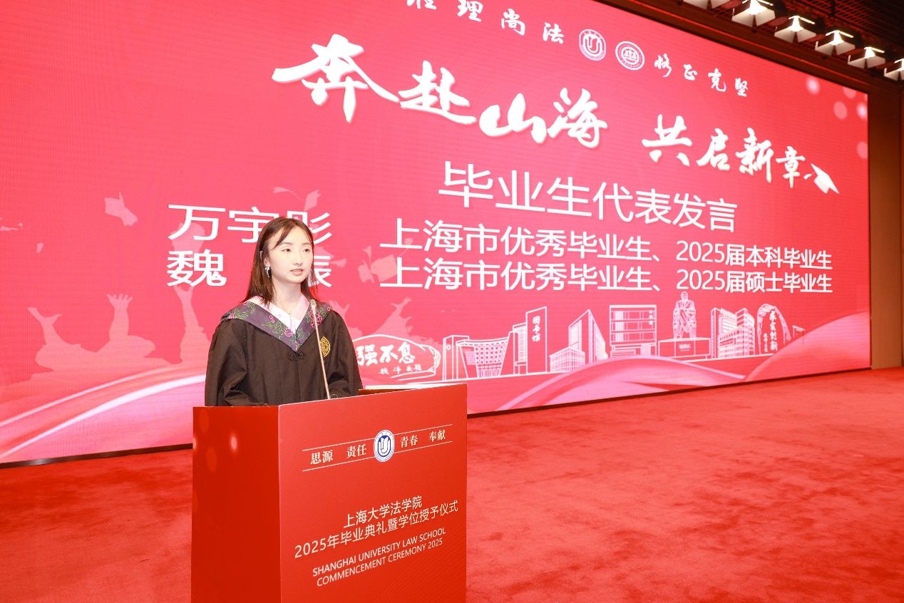 上海市优秀毕业生、2025届本科毕业生代表万宇彤同学以自己的亲身经历和感受为主线,回顾了在太阳成集团tyc9728四年的学习和成长历程,分享了自己在法学专业上的探索与收获,以及在自我认知和人生选择上的思考与感悟。同时,也表达了对母校、老师、同学的感激和不舍之情,对同学们未来发展的美好祝愿,以及对太阳成集团tyc9728和母校的真诚祝福。
