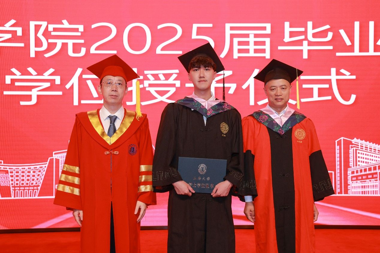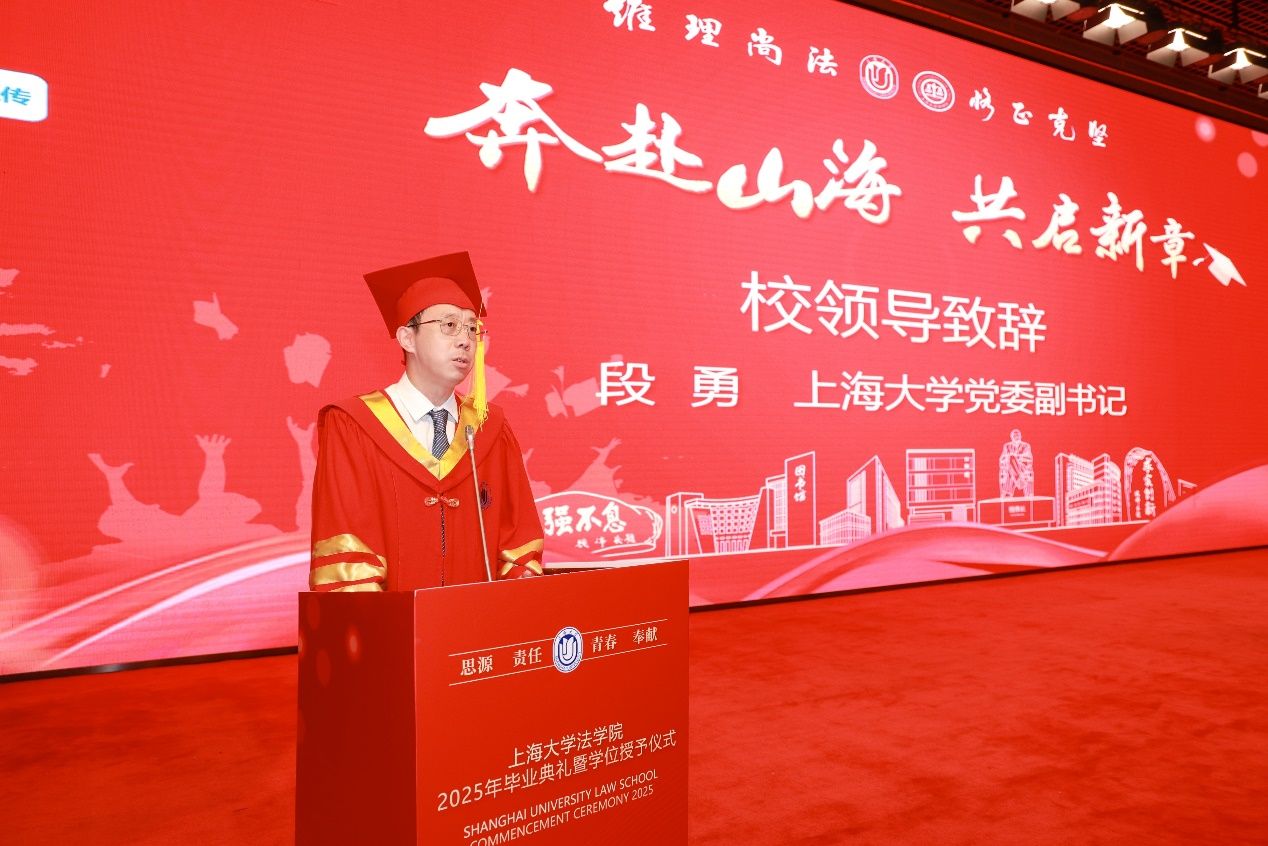 9728太阳集团党委副书记段勇教授为全体毕业生送上诚挚祝福与殷切嘱托,鼓励同学们在面对复杂社会环境与就业形势时保持积极的态度,通过这三句充满哲理的箴言,鼓励大家以开放心态、全面认知和人格平等的理念迈向未来,保持扎实与自信:“古今一也,人与我同耳”,寄语同学们学会换位思考,更好地认识自己与他人;“兼听则明,偏信则暗”,警醒大家要有意识地从不同渠道获取信息,保持全面的认知,避免陷入信息茧房;“己所不欲,勿施于人”,希望大家在今后的生活、工作中尊重他人,以真诚和善良对待。最后,段书记以于右任老校长与钱伟长老校长的“大任于斯,江山有待;伟业流长,自强不息”寄语全体毕业生,激励大家坚守信念,勇敢追梦。并衷心祝愿同学们前程似锦,未来可期!