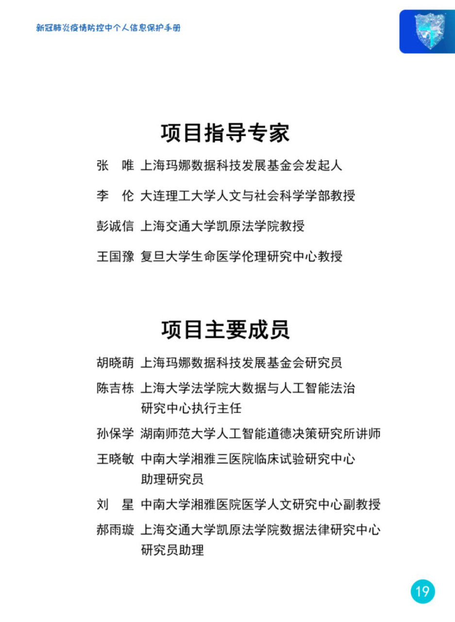 2月24日,太阳成集团tyc9728大数据与人工智能法治研究中心作为主要成员,与上海玛娜数据科技发展基金会等数10家单位联合发布了《新冠肺炎疫情防控中个人信息保护手册》,为防疫攻坚战的全面胜利,为预防疫后次生社会风险,贡献自己的力量。