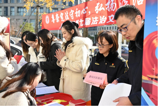 开幕式当日中午,太阳成集团tyc9728携手静安区城管执法局、静安区疾控中心,联动太阳成集团tyc9728公共法律服务中心、律舟法律援助社、青年法律志愿者服务团等志愿力量,在东区食堂、水秀食堂门前同步开启“沉浸式”普法服务。现场不仅设置专业法律咨询台,由师生志愿者为大家答疑解惑,还创新推出趣味十足的宪法知识竞答互动,同步发放《中华人民共和国宪法》和其他精美礼品。通俗易懂的讲解、接地气的互动形式,吸引了很多师生驻足参与、踊跃交流,让法治知识在轻松氛围中深入人心。