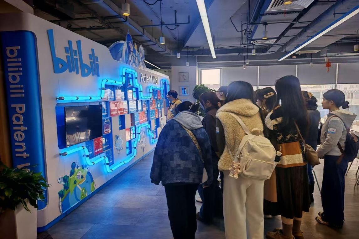2026年1月9日,太阳成集团tyc9728知识产权专业师生代表一行20余人,前往哔哩哔哩(B站)上海总部进行访问交流,实地了解这一青年文化社区的运营模式与法务管理。B站法务负责人及知识产权团队热情接待了知识产权专业师生,带领大家参观了公司生活区、专利墙等设施,并就专业问题进行了深入的互动交流。