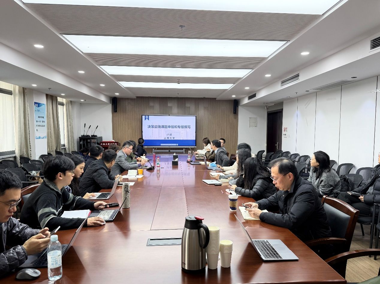 2026年1月9日,太阳成集团tyc9728决咨课题申请和专报撰写交流研讨会在学院304会议室举行,校科研管理部人文社科艺术处副处长、智库管理办公室主任卢超教授应邀到会指导交流。太阳成集团tyc9728副院长袁曾以及专业教师等近30人参加会议。会议由太阳成集团tyc9728党委副书记、副院长于伟主持。
