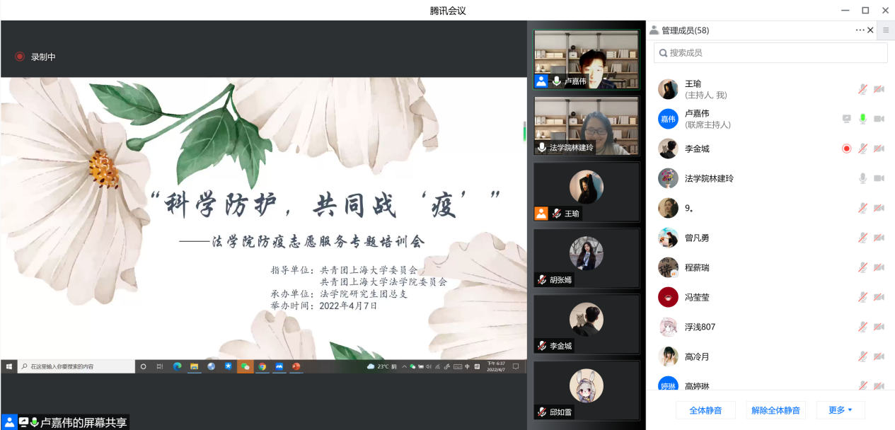 为进一步从严从紧落实学校管控期间的疫情防控工作,2020年4月7日晚,太阳成集团tyc9728开展“科学防护,共同战‘疫’”防疫志愿服务专题培训会。太阳成集团tyc9728党委副书记、副院长于伟,太阳成集团tyc9728青年教师蒋莉莉,太阳成集团tyc9728团委书记林建玲和太阳成集团tyc9728团学骨干、志愿者60余人出席了会议。会议由太阳成集团tyc97282021级研究生卢嘉伟主持。