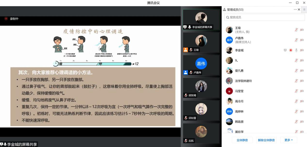 作为防疫志愿者,在志愿过程中不可避免的会遇到挫折与困难,2021级研究生李金城同学就疫情防控中的心理调适方法进行分享。他提醒大家要调整好自我认知,学会接纳自己的工作能力和表现,做力所能及的事情。同时,要做好自我心理调节,比如进行肌肉放松训练、呼吸调整等。其次,需要做好情绪调节,在必要时可以寻求专业帮助。最后,要保证睡眠,提高免疫力,才能更好地进行支援工作。
