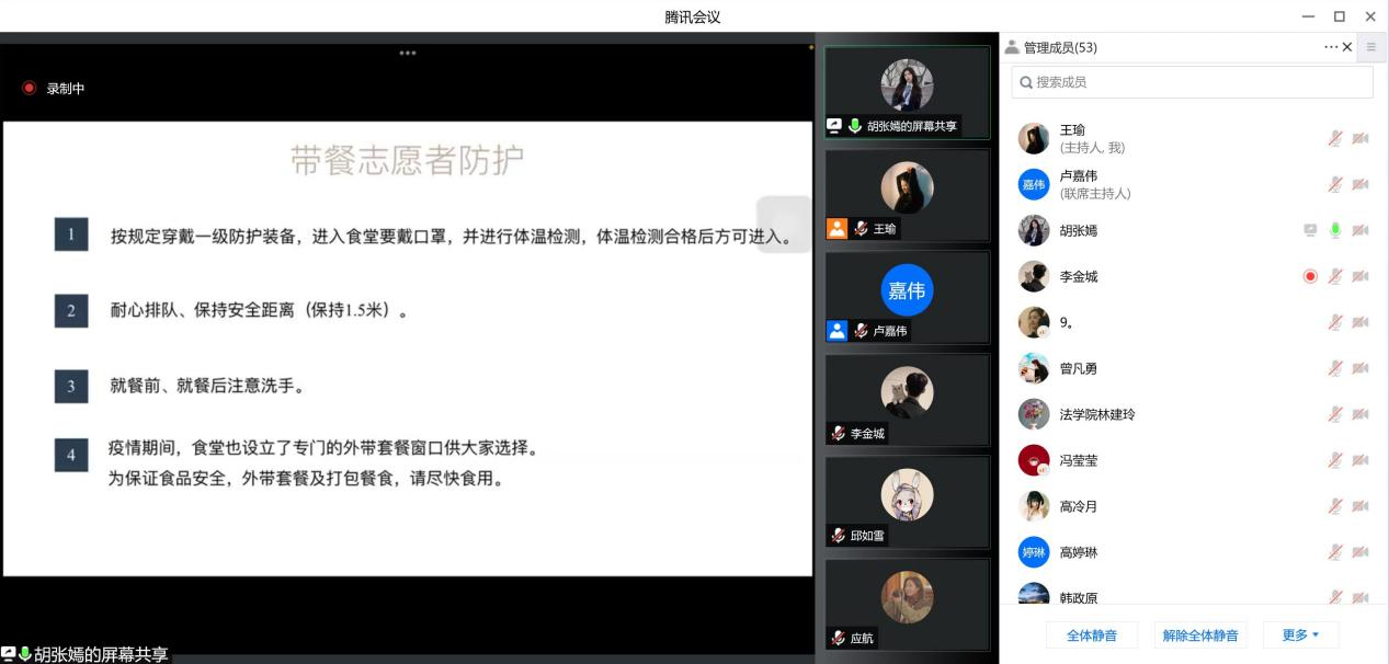 在封闭模式期间,同学身边涌现了一位位“打饭侠”,2021级研究生胡张嫣同学就疫情期间带餐过程中以及寝室里的防护问题同大家进行了分享。如:带餐志愿者要按照规定穿戴一级防护装备、保持安全距离;同学们在宿舍中,每天进行健康监测、注重宿舍中空气的流通;封闭模式下在寝室里也可以进行适量的运动,避免久坐等。大家在注重自我健康保护的同时也能在一定程度上减轻志愿者的压力。