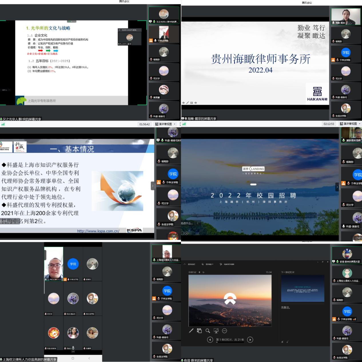 上海光华专利事务所、贵州海瞰律师事务所、上海科盛知识产权代理有限公司、上海澜亭(杭州)律师事务所、上海市信义律师事务所、上海蔚来汽车有限公司等优质单位提供了包括商标代理人助理、知识产权管理销售、专利事务律师、数据合规法律顾问、实习律师、律师助理等31个工作岗位。招聘宣讲人员主要从单位太阳概况、招聘岗位、人才培养计划、福利补贴等方面进行宣讲介绍。通过对核心业务板块、竞争优势、岗位特性、业务特点、人才培养机制、办公环境等方面的介绍,同学们初步了解到公司太阳概况与企业文化。各用人单位都特别介绍了本单位的人才培养计划,还就毕业生关心的薪资福利等问题进行了讲解。