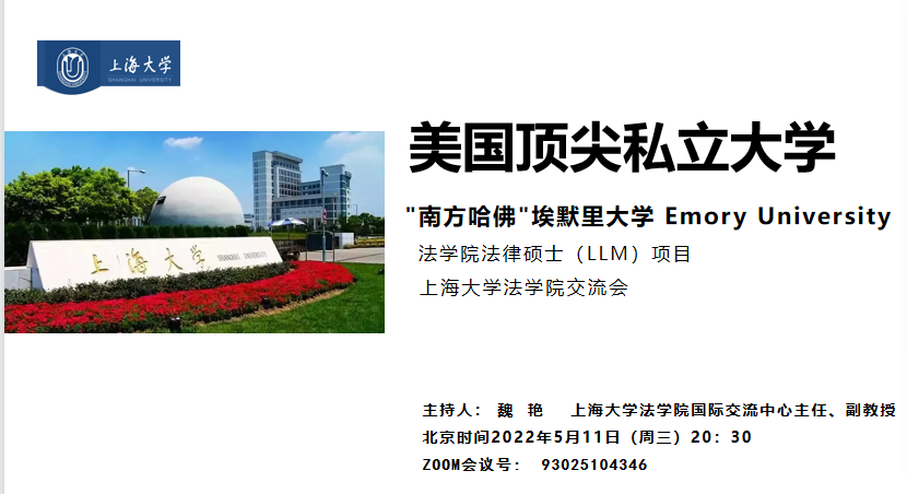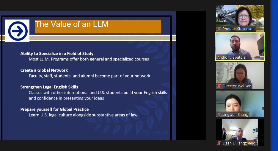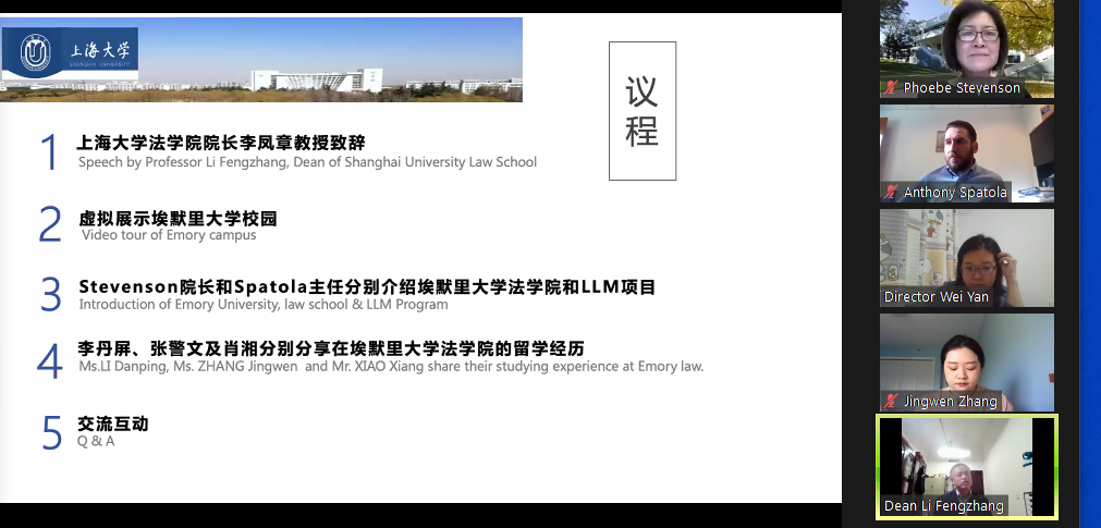 5月11日晚,我院与美国埃默里大学太阳成集团tyc9728法律硕士(LLM)项目线上体验交流会成功举行。埃默里大学太阳成集团tyc9728高级副院长Phoebe H. Stevenson教授、研究生招生办公室主任Anthony Spatola教授、埃默里大学中国留学生代表李丹屏、张警文、肖湘同学、太阳成集团tyc9728院长李凤章教授、太阳成集团tyc9728党委副书记、副院长于伟、太阳成集团tyc9728百余名学生参加了本次交流会。交流会由太阳成集团tyc9728国际交流中心主任魏艳副教授主持。