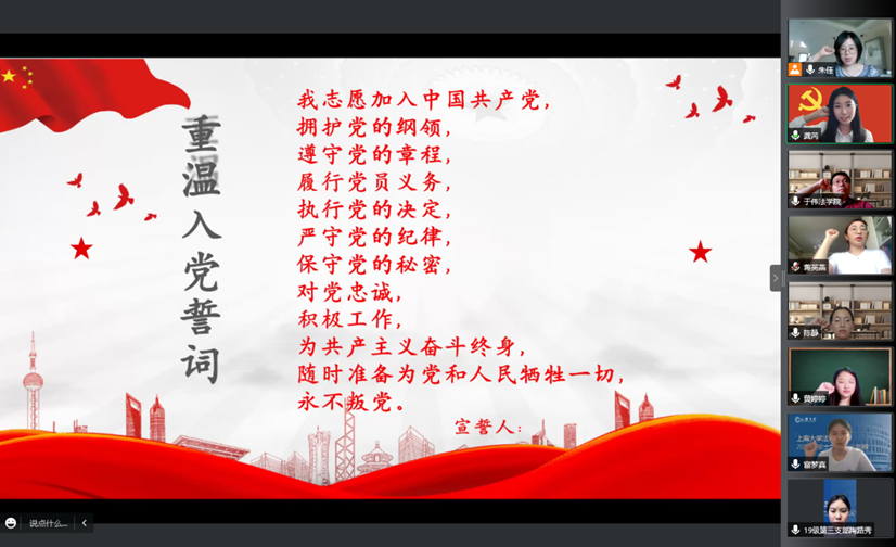 紧接着,王萌、黄婷婷同学作为本科和研究生毕业生党员代表作了交流分享。王萌同学提到,3月24日中国上海市委发布致全市共产党员一封信后,太阳成集团tyc9728党员同志积极响应倡议精神,带头担起政治责任、带头发挥党员作用、带头联系服务群众、带头做好宣传引导,在未来的日子里也将不忘初心、砥砺前行。