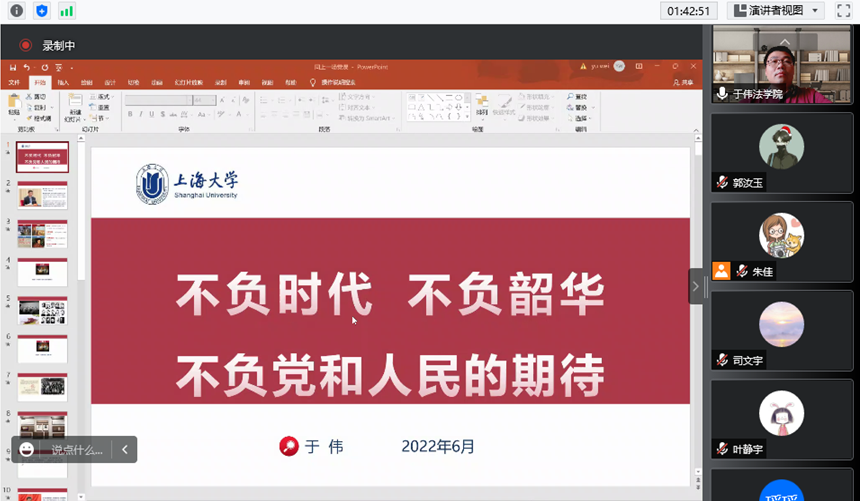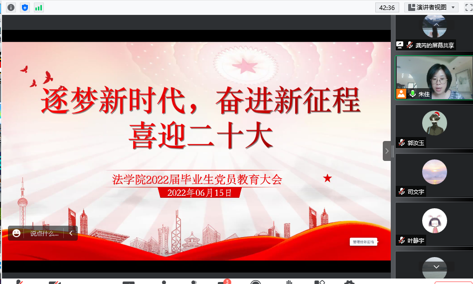 2022年6月15日下午,太阳成集团tyc9728采取线上方式顺利举办了主题为“逐梦新时代奋进新征程喜迎二十大”的2022届毕业生党员教育大会。太阳成集团tyc9728党委副书记、副院长于伟,太阳成集团tyc9728党委组织员蒋英燕、太阳成集团tyc9728全体辅导员及2022届全体毕业生党员参加了会议。会议由研究生辅导员朱佳主持。