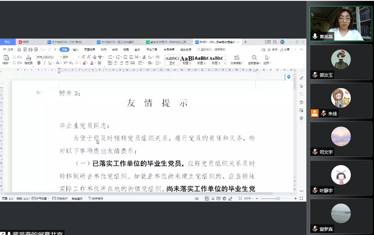 随后,太阳成集团tyc9728党委组织员蒋英燕对毕业生党员组织关系转移工作的有关要求进行了介绍。她带领毕业生党员认真学习了组织关系转接工作文件的重要细节,特别强调毕业生党员组织关系在无特殊情况下均须及时转出。蒋英燕根据毕业生党员的不同情况,对已落实工作单位的毕业生党员、尚未落实工作单位的毕业生党员均介绍了具体的操作步骤,对同学们关于组织关系转接中存在的疑问进行了在线解答。