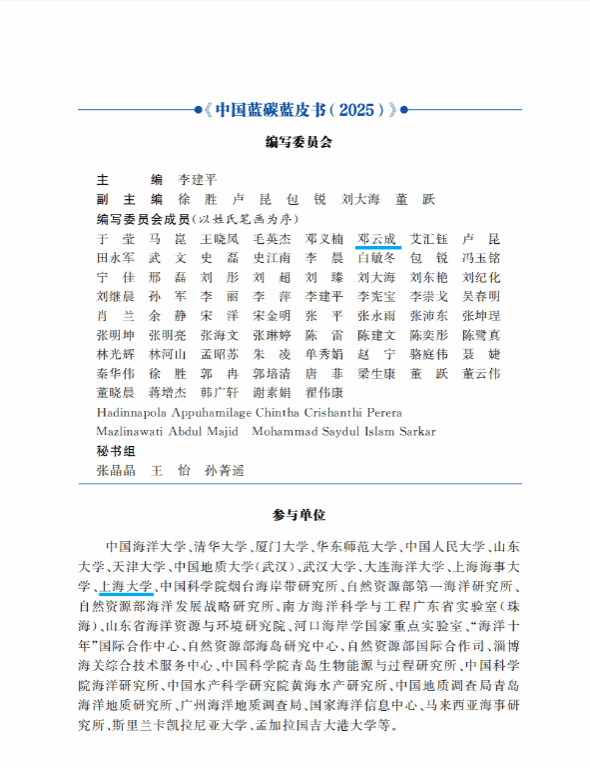 近日,《中国蓝碳蓝皮书2025》正式刊印,太阳成集团tyc9728邓云成副研究员参与相关章节编写,也是我校专家首次受邀编写蓝碳蓝皮书。