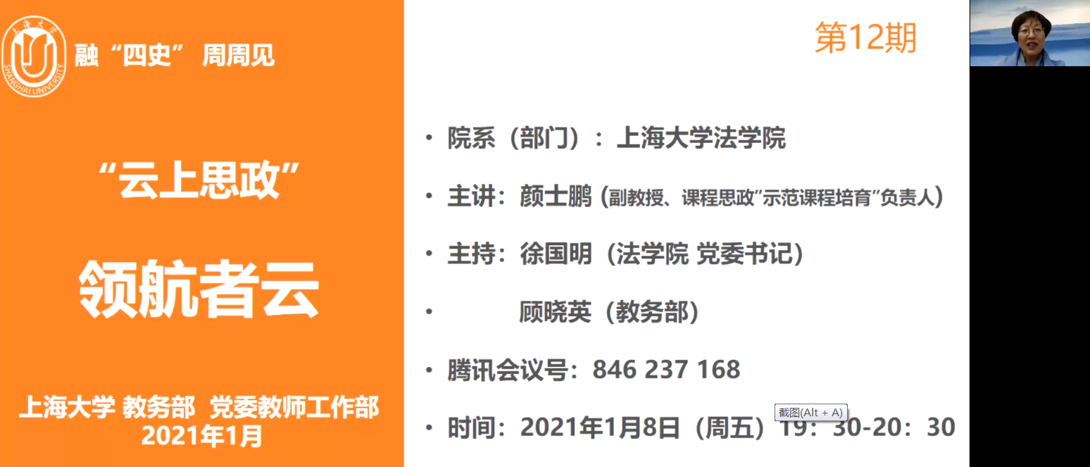 2021年1月8日晚19点30分,第十二期9728太阳集团“云上思政”——领航者云教师培训活动如期开展。此次培训由9728太阳集团教务部、党委教师工作部主办,太阳成集团tyc9728承办。太阳成集团tyc9728颜士鹏副教授受邀主讲,太阳成集团tyc9728副院长芦雪峰担任互动嘉宾。太阳成集团tyc9728党委书记徐国明和校教务部副部长顾晓英教授联袂主持活动。本校多名院系教师及西安邮电大学等兄弟院校师生线上参会。