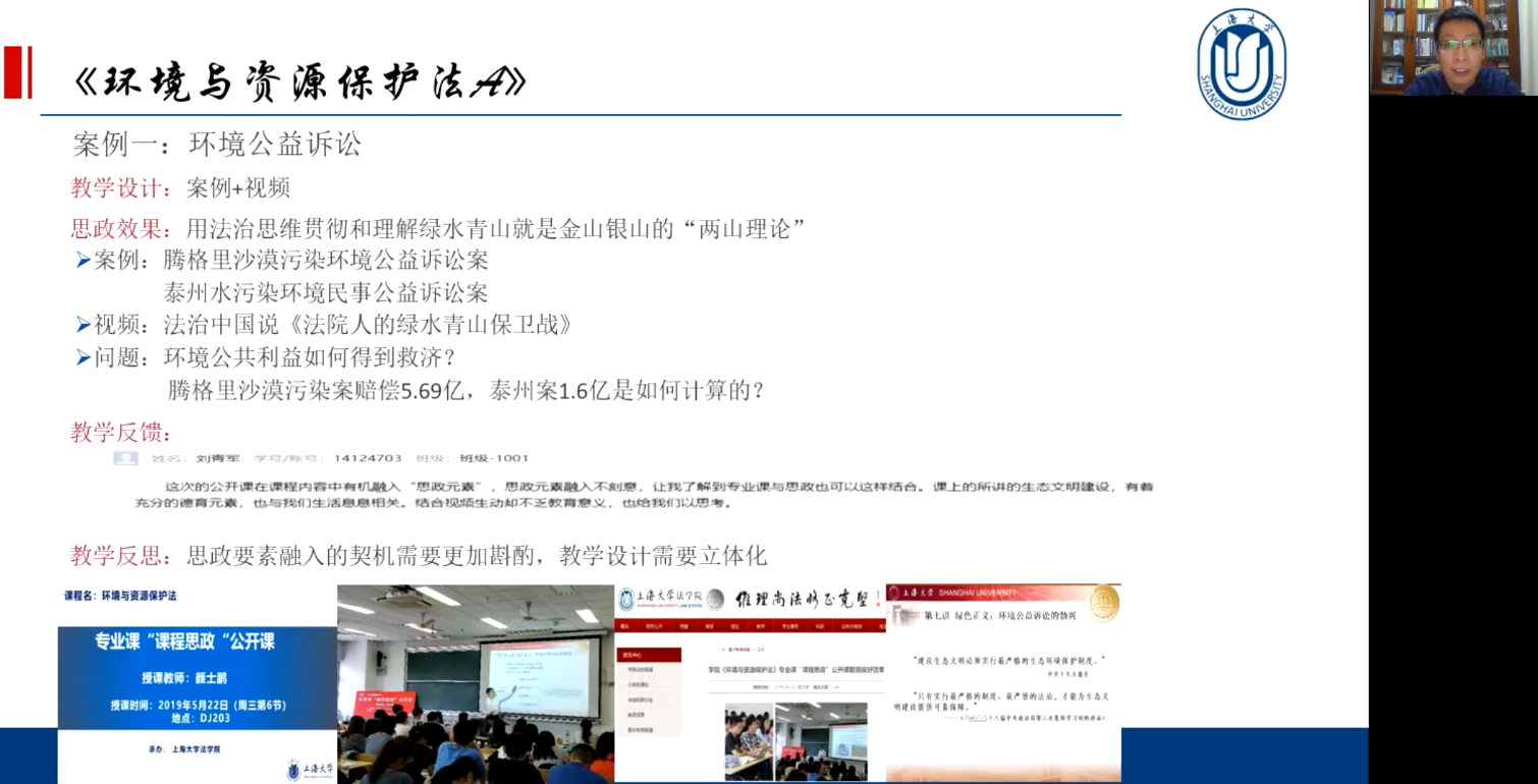 在互动环节,校法务办副主任陈敬根教授作为代表发言。他表示颜老师的分享让他感受到课程设计视野的开阔,带领大家用全球化的视野来分析环境资源法律保护问题;课程讲授细数“是什么、为什么、怎么办”,推进逻辑清晰,法制观念层层深入;并切合习近平总书记人类命运共同体的理念和“两山”理论,深入浅出,将专业知识与“思政元素”融会贯通。陈老师认为这就是一门好的“课程思政”专业课,生动灵活融入“思政元素”,对他自己做好课程建设有很多启发。同时他建议颜老师可以结合时下习近平总书记的“人民的城市人民建,人民城市为人民”的理念,立足上海,关注水环境的改善,进一步丰富《环境与资源保护法》的课程思政内容。