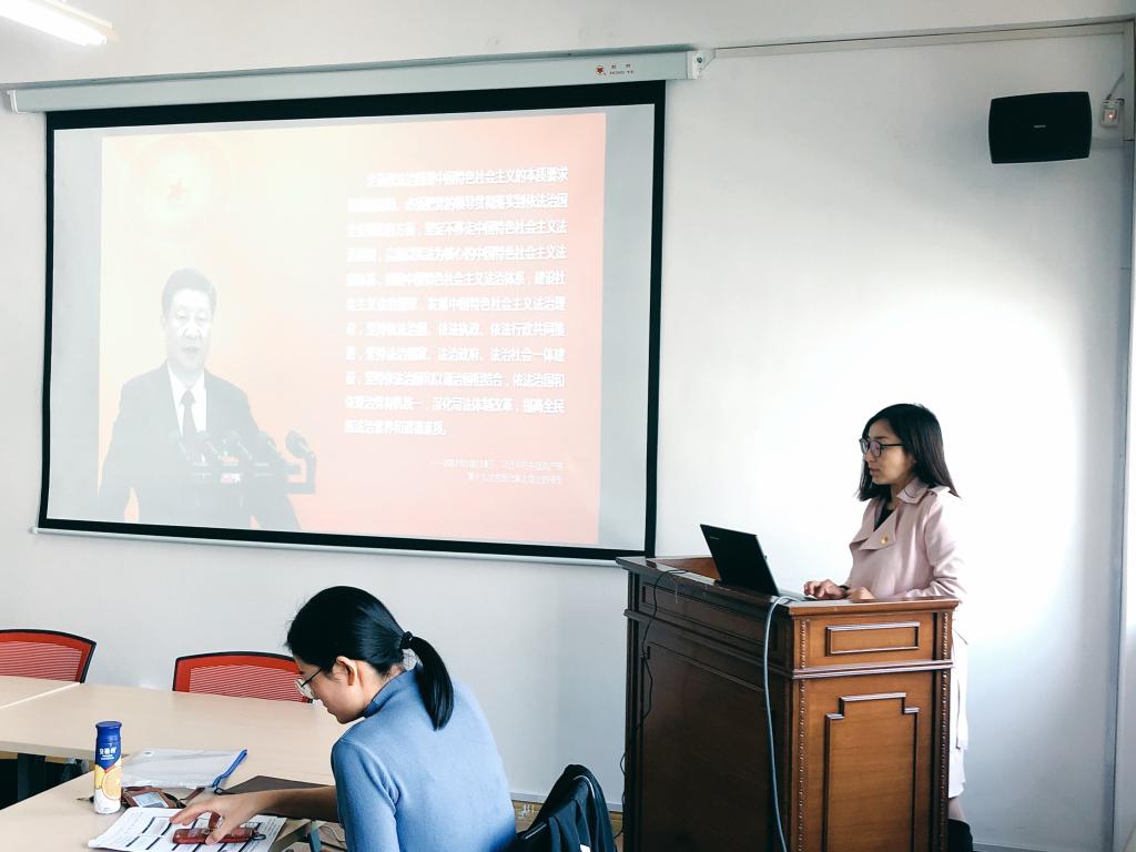 接下来蒋英燕老师带领全体成员学习了“建设社会主义法治国家”主题的有关内容。在此课程中,蒋老师首先引用了习近平主席在中共十九大上的有关建设社会主义法治国家的讲话内容,之后提出了有关依法治国、中国特色社会主义法治道路、中国特色社会主义法治体系建设等有关问题带领大家深入思考有关建设社会主义法治国家的各方面问题。之后分“明确全面推进依法治国总目标”、“坚定不移走中国特色社会主义法治道路”、“加快建设中国特色社会主义法制体系”、“深化依法治国实践”、“加强党对全面依法治国的领导”五个方面层层递进来讲述有关建设社会主义法治国家应当遵守的目标,坚持的精神,有效的方式等内容。