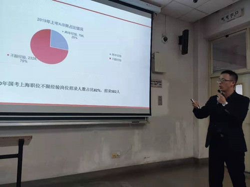 为了加强同学们对公务员考试相关信息的了解,会议第二部分邀请到了中公教育的资深讲师宁鑫老师为大家作最新的国考、上考政策解读以及岗位数据分析。宁鑫老师表示,正所谓考得好不如报的好,2020年国家公务员考试公告已经发布,对于报考今年国考的同学,除了积极备考以外,一定也要重视公告和职位表,然后结合自身优势,筛选出最适合自己的岗位进行报考。最后,宁老师还结合自身多年经验和体会,与在场的同学进行了交流互动,详细解答了同学们提出的问题,令同学们受益匪浅。