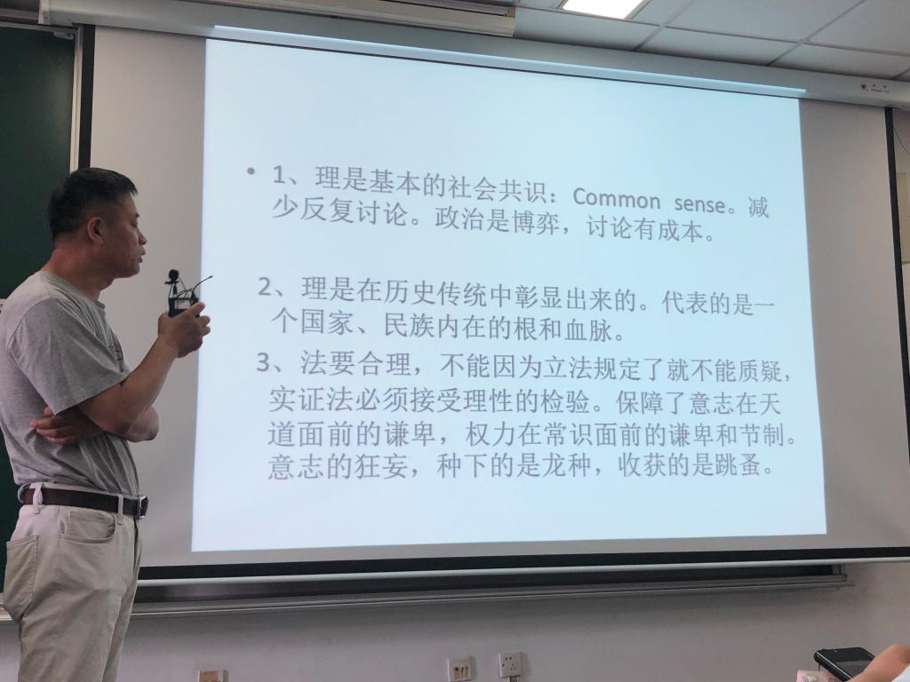 首先,李老师对院训“维理尚法”进行了深入的阐释。老师首先提出,人类社会中有一些基本的共识性条件:对生命的尊重、对契约的遵守、对侵害的追究,这些是经历了千百年人类文明凝结下来的,是信仰的常识。接着,老师指出,理是社会的基本共识,它在历史的传统中彰显出来,代表了一个国家,民族内在的根和血脉。立法与司法是在有“理”的基础上得以进行的。立法与司法都要合理,不能因为立法规定了就不能质疑,实证法必须接受理性的检验。这保障了意志在天道面前的谦卑,权利在常识面前的谦卑和节制。同时,李老师指出维理尚法是法律人应该具备的思想指引,是法律人用法律对他人的行为作出衡量与裁判的尺标。