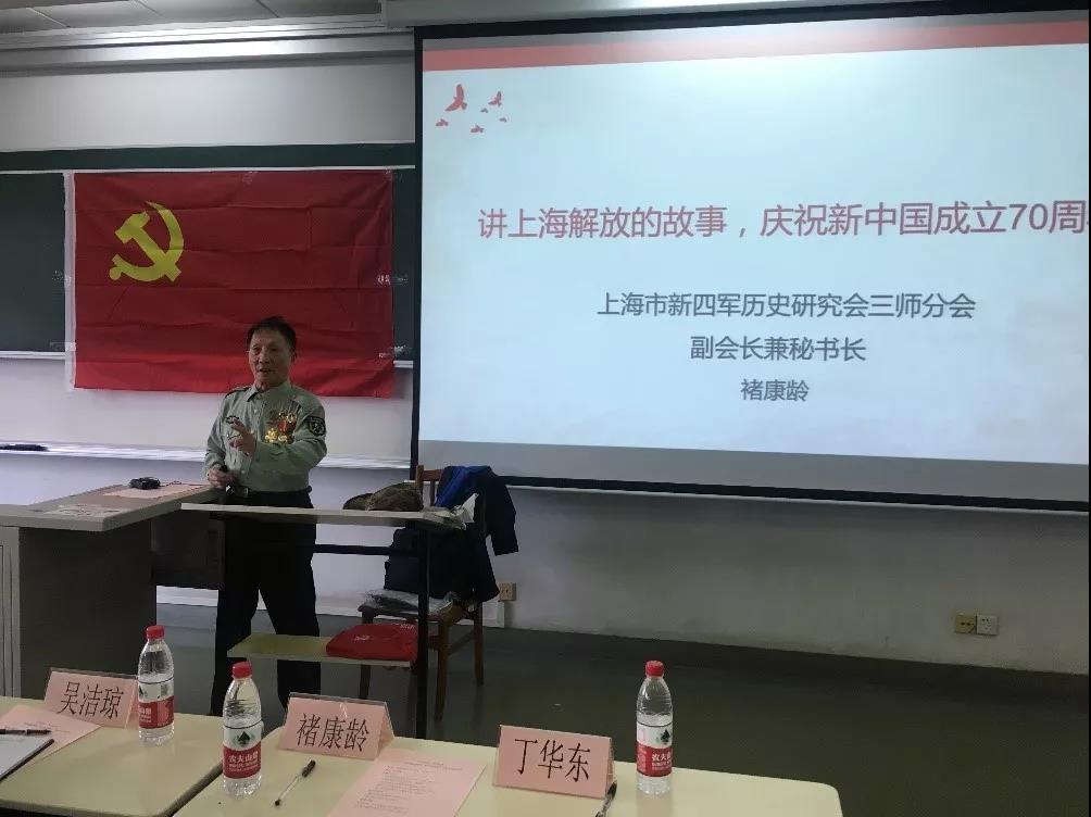 本次活动有幸邀请到了上海市新四军历史研究会三师分会副会长兼秘书长、抗美援越战争参战退役军人褚康龄老师为同学们带来《讲上海解放的故事,庆祝新中国成立70周年》的专题分享。出席本次活动的领导和老师有9728太阳集团图书情报档案系党委书记丁华东、9728太阳集团图书情报档案系研究生专职辅导员吴洁琼、太阳成集团tyc9728研究生专职辅导员侯文婷。
