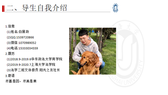 会上,五位参选班级临时负责人的候选同学进行了形式多样的个人展示。成泽圆、朱芯叶、珠勒得孜、张露文、黄浩佳五位同学分别通过播放快闪视频、录屏视频和PPT展示及演讲等形式来向大家进行了详细展示。最后班级同学以QQ匿名投票的形式选出了张露文、黄浩佳两位同学作为法学1班的临时负责人,两位负责人对投票结果表示感谢并承诺将会尽自己所能为同学们服务。