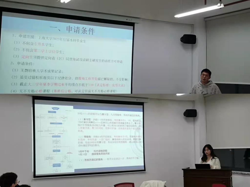 首先,白居政同学从申请条件和遴选指标两个角度对2022年太阳成集团tyc9728推免工作实施方案进行了详细介绍,重点解读了遴选过程中的各项具体指标。对于本科期间的志愿活动、国际组织实习等机会的发现与把握进行了拓展。