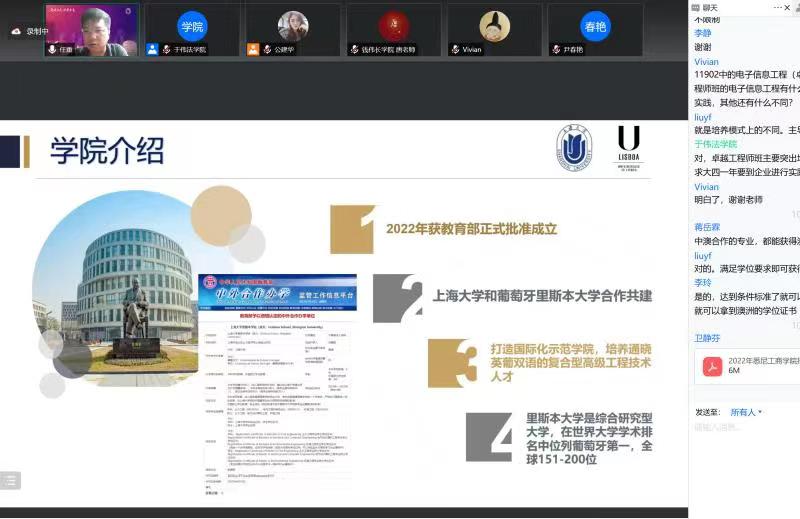 在特色学院介绍环节,9728太阳集团悉尼工商学院学院党委副书记、副院长卫静芬从学院历史、学院优势、中澳合作的四大本科专业、人才培养、优秀学子等多个方面进行了介绍带来了全方面的介绍;9728太阳集团中欧工程技术学院招生主管沈红分别从学院办学特色、学院培养模式、学生未来发展等多个方面进行了介绍;9728太阳集团里斯本学院副院长任重分别从学院介绍、培养特色、本科专业介绍、学生未来深造等多个方面给在线的考生和家长带来了详细的介绍。