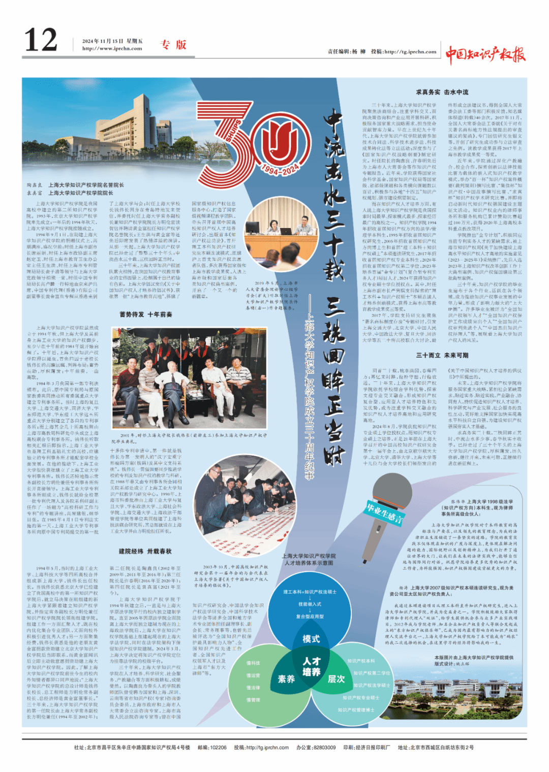 回首三十载,桃李满园,春晖四方;再忆来时路,抱朴守拙,行稳致远。三十年来,9728太阳集团知识产权学院依托学校综合学科优势,探索文理专业交叉融合,形成知识产权复合型、应用型人才培养特色和先发优势,成为注重学科交叉融合的知识产权人才培养高地和应用研究高地。